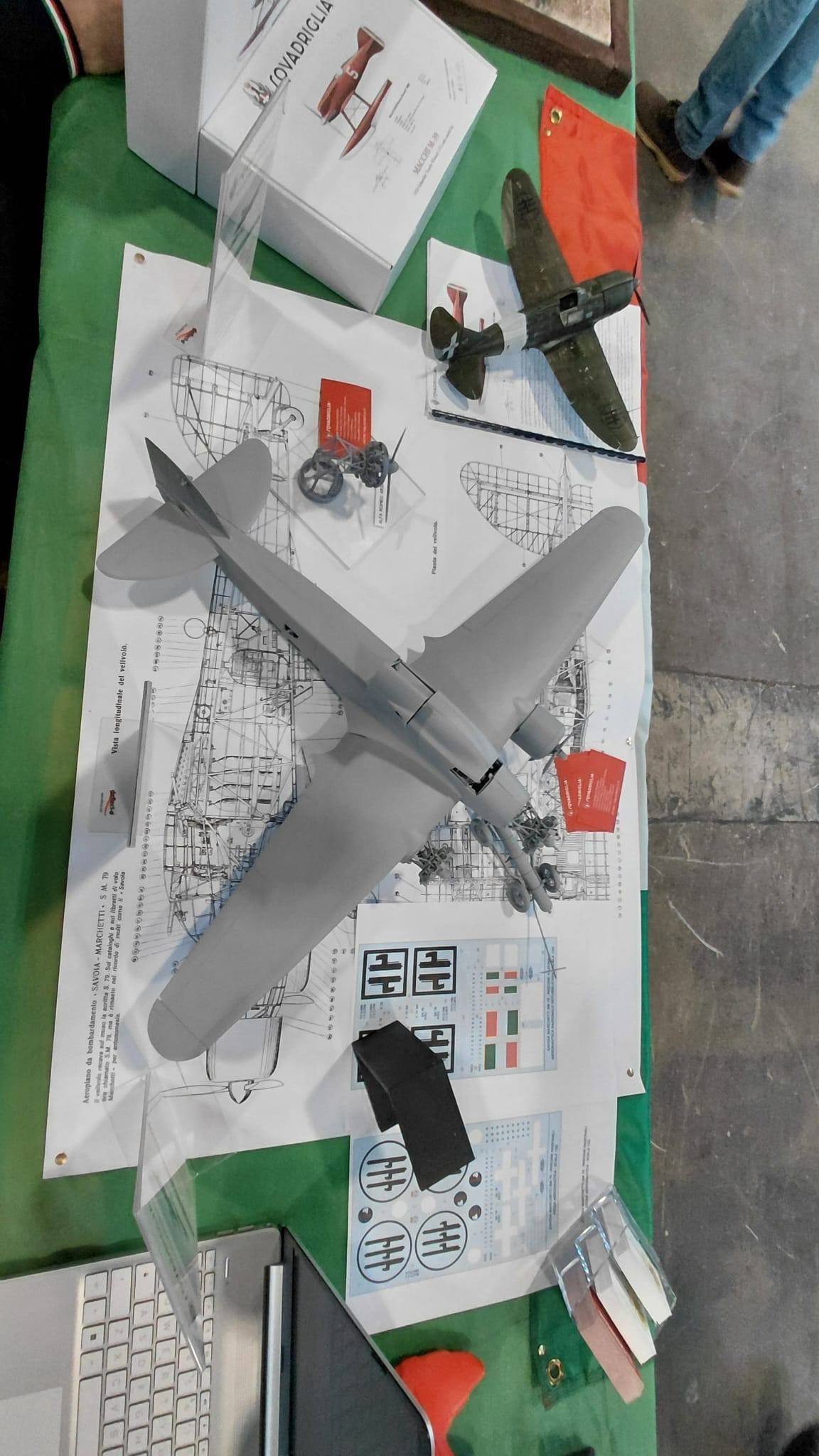 Già i primi visitatori si soffermano sull’allestimento dello stand; quando Roberto — che ha realizzato il W.I.P. del grosso kit facendo notte — estrae il “mostro” dallo scatolone, imballato alla perfezione: le bocche degli astanti si aprono in un’espressione di stupore e meraviglia. Appoggiamo con molta attenzione il modello sul tavolo, sopra al piano di costruzione della SIAI Marchetti originale; Roberto aggiunge un siluro sul suo carrello, pronto per essere issato sotto alla pancia dello Sparviero.